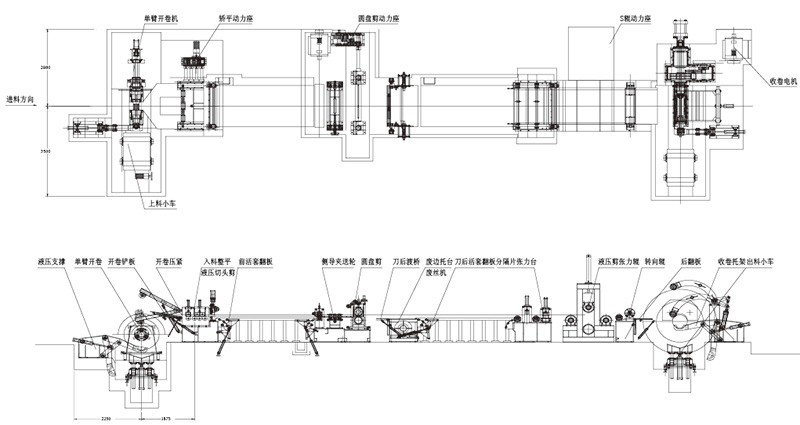 機(jī)組由上料小車、開卷機(jī)、牽引機(jī)、縱剪機(jī)、線外卷邊機(jī)、活套II、張力臺(tái)、卷取機(jī)、卸料小車、液壓系統(tǒng)和電控系統(tǒng) 總成。